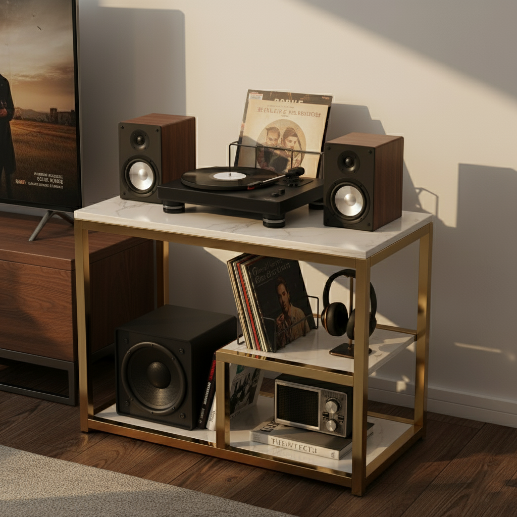 - El "Setup" de Audio: Como ves en las fotos, las dimensiones calzan perfecto para un tocadiscos arriba y tu colección de vinilos abajo. Es una estación de entretenimiento compacta.